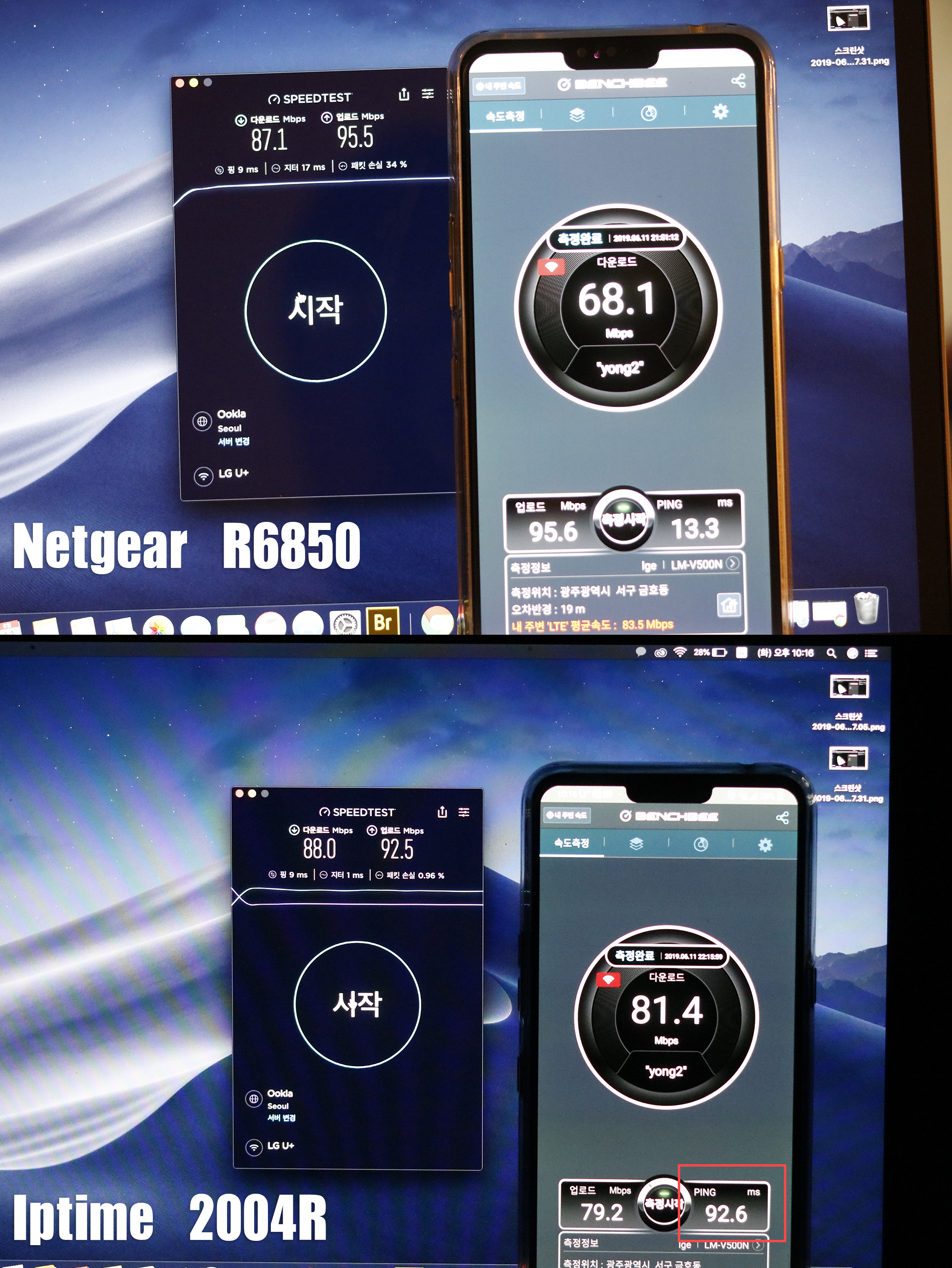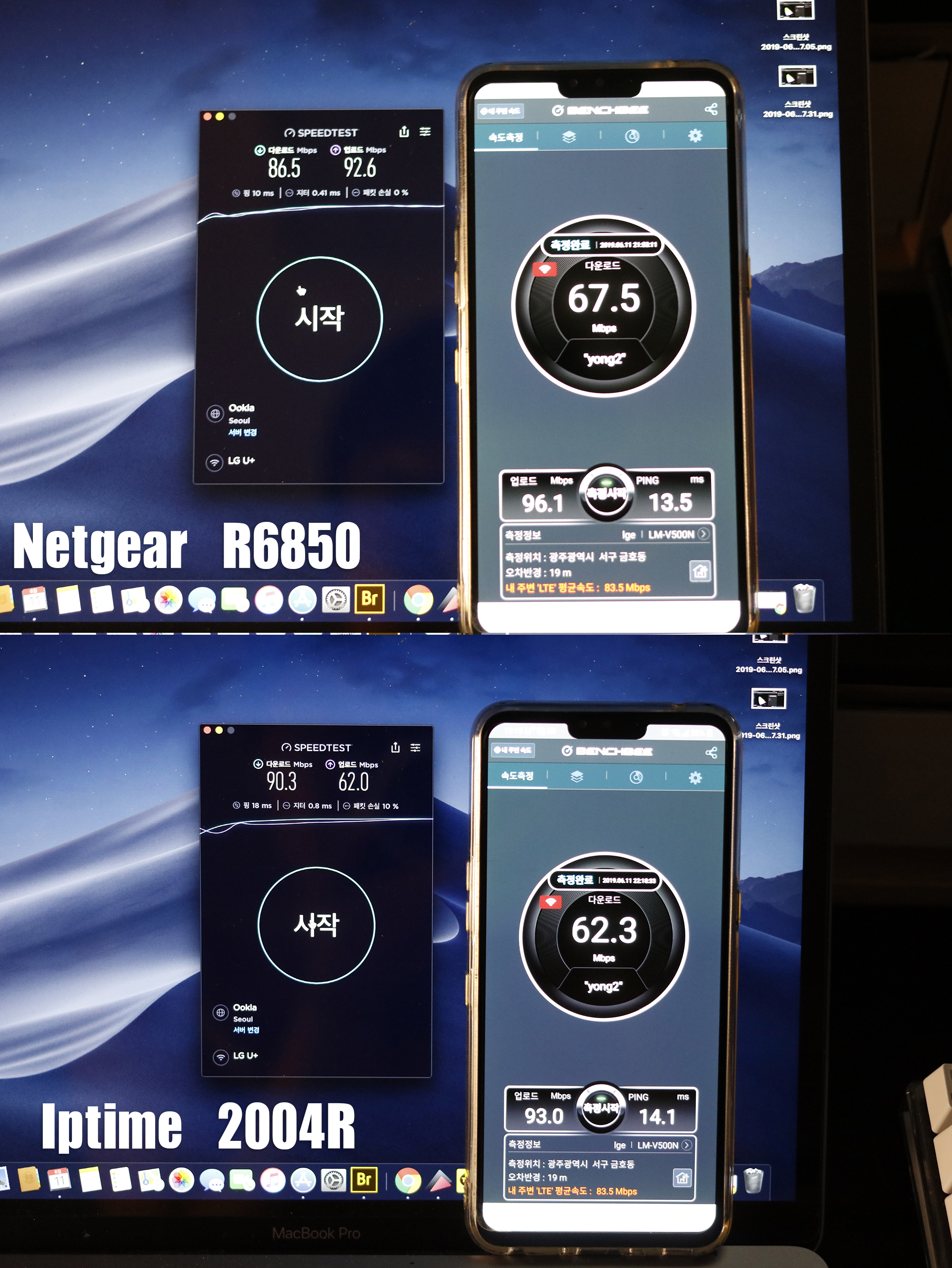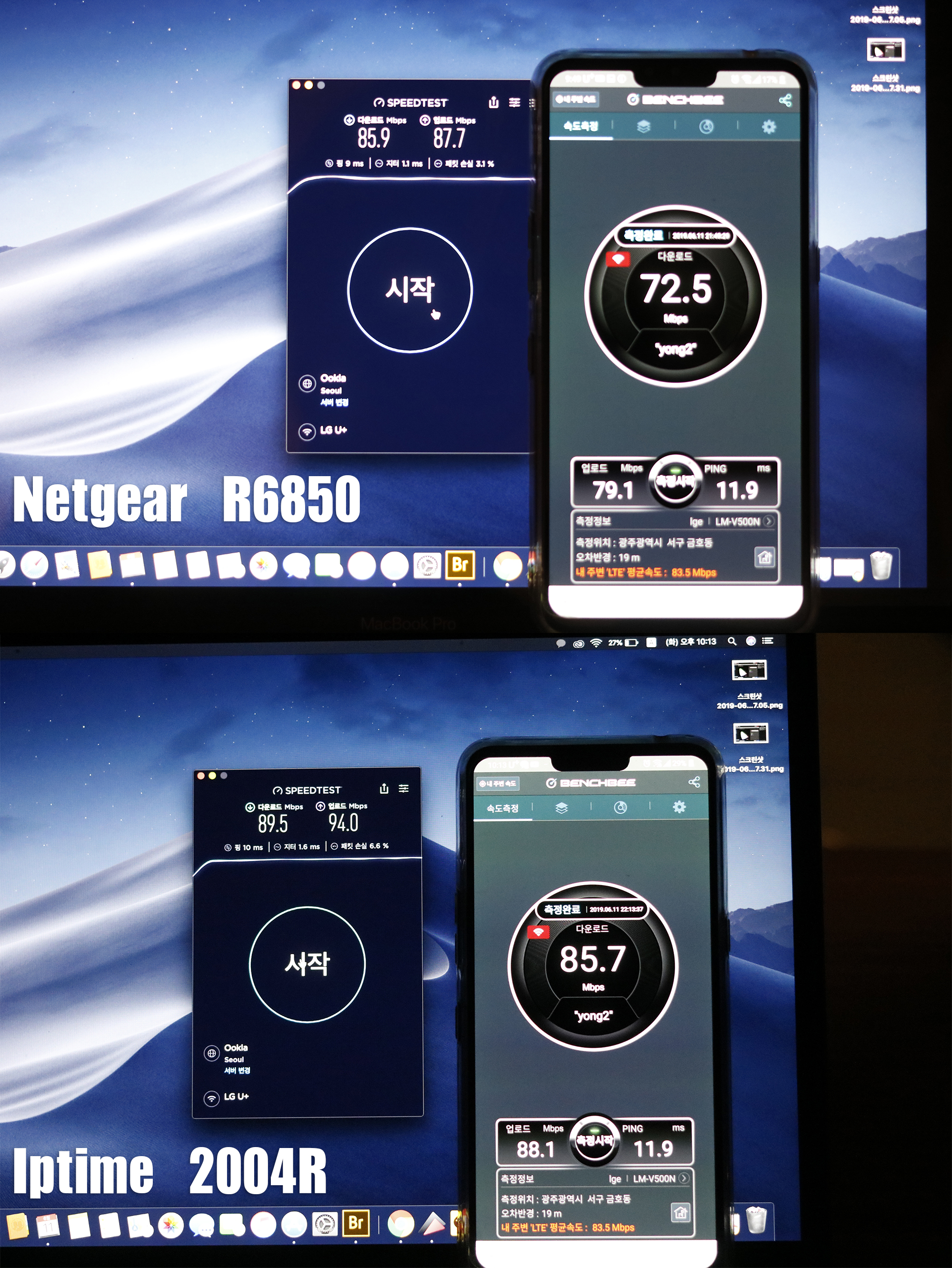 공유기 바로 옆에서 2개의 공유기를 비교해가면서 테스트...테스트한 제품은 맥북프로 2018버전과 LG V50 씽큐 스마트폰으로 5Ghz영역에 대해서만 테스트를 진해했다. 2.4Ghz가 더 멀리 퍼져 나가기는 하지만, 어디까지나 속도에 있어서는 5Ghz에서 대부분 뽑아져 나온다.